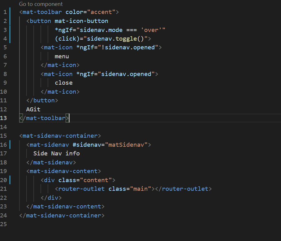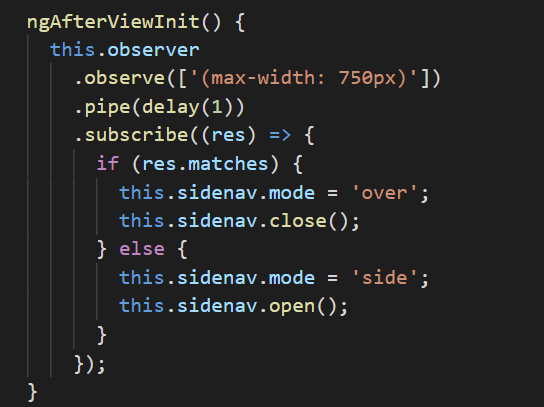 The codes just quite simple, the side nav is toggled between ‘over’ and ‘side’ mode based on a BreakpointObserver. A mat icon is shown if we are in over mode and this will toggle the side nav to be shown.