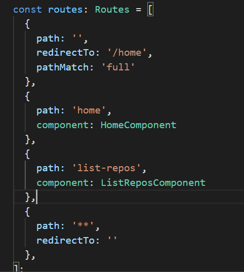 Next I added the routing and an option in the menu. Adding to the routing in angular is simple, at its most basic level you just need to add another path and component to the routes array. While I was at it I added some routing always route back to the home page, the entry point to the app will also enforce always routing to home on start-up.