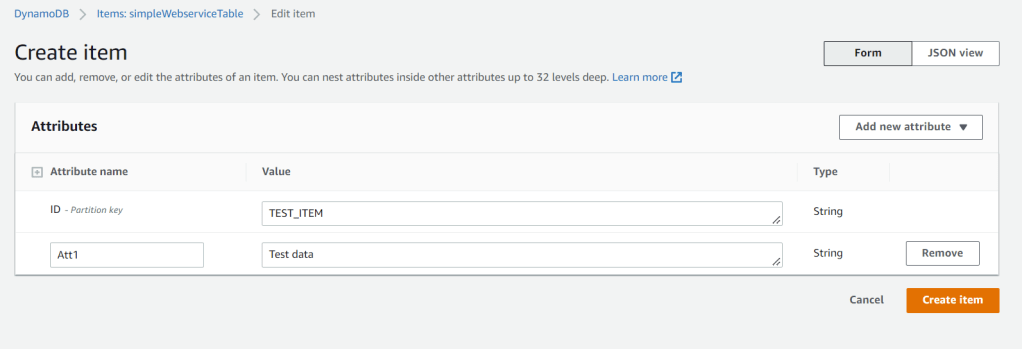 To add an item, navigate to the dynamo service, select the table created (called simpleWebserviceTable) and click add item.