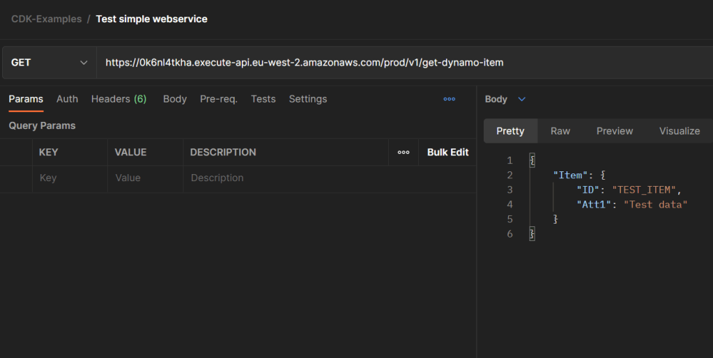 You can now hit the API. The base URL can be found as a result of the build process. Added to the end of this url we need to add the resource and the method (/v1/get-dynamo-item).